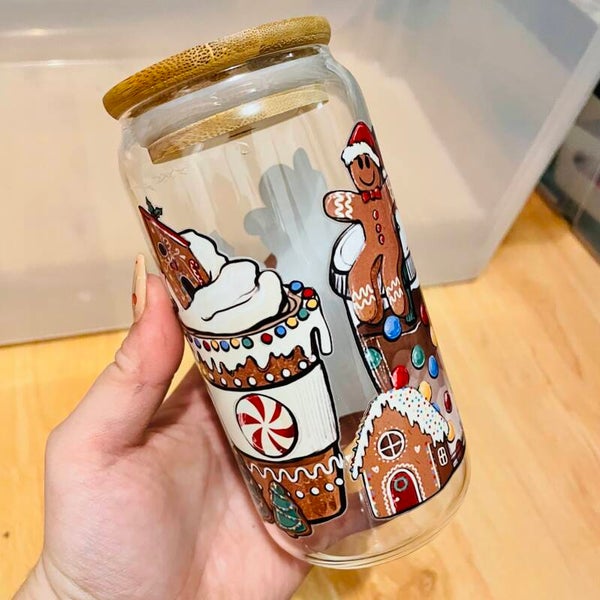 Verre 550ml avec couvercle bois. Sur le thème de Noël.