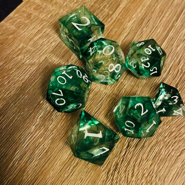 Lot de 7 dès en résine epoxy personnalisable.